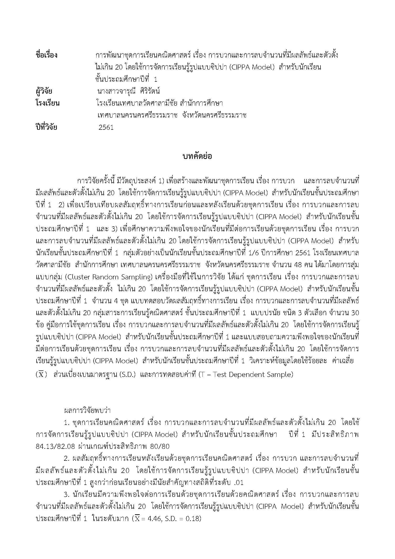 ชื่อผลงาน : การพัฒนาชุดการเรียนคณิตศาสตร์ เรื่อง การบวกและการลบจำนวนที่มีผลลัพธ์และตัวตั้งไม่เกิน 20 โดยใช้การจัดการเรียนรู้รูปแบบซิปปา (CIPPA Model) สำหรับนักเรียนชั้นประถมศึกษาปีที่ 1