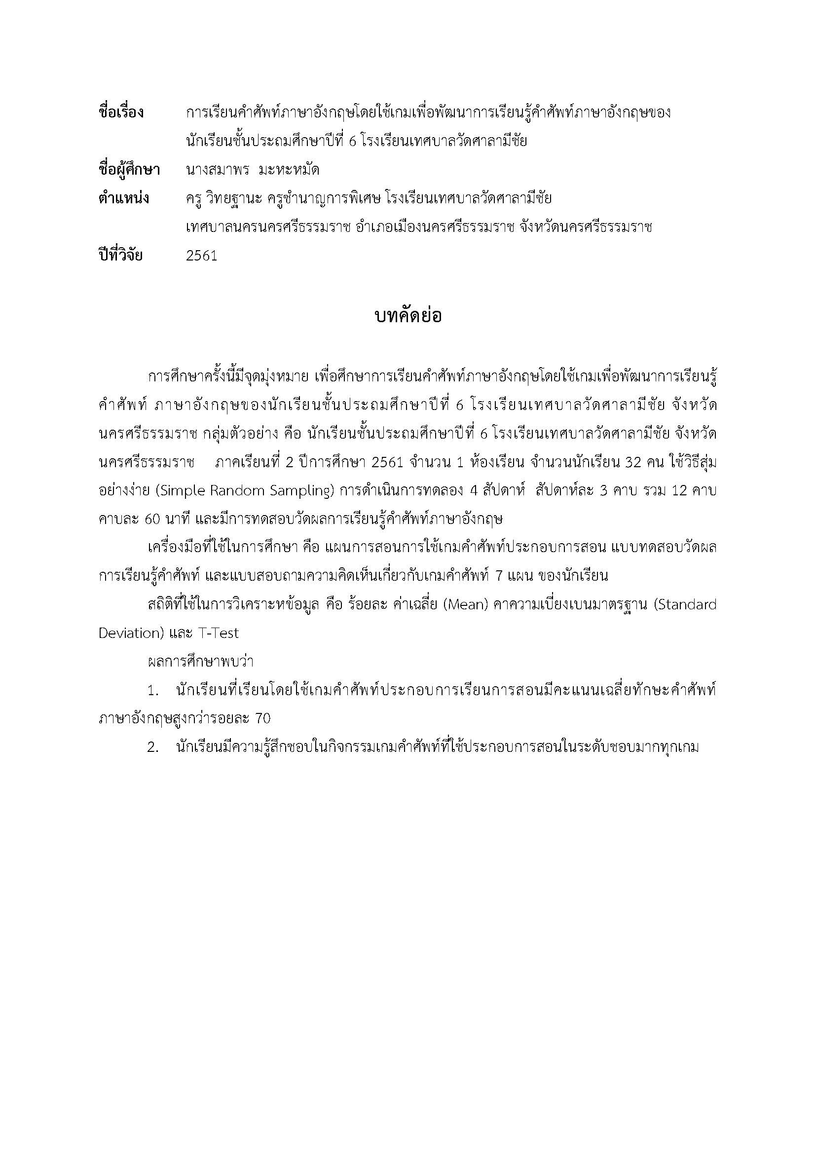 ชื่อผลงาน : การเรียนคําศัพท์ภาษาอังกฤษโดยใช้เกมเพื่อพัฒนาการเรียนรู้คําศัพท์ภาษาอังกฤษของนักเรียนชั้นประถมศึกษาปีที่ 6 โรงเรียนเทศบาลวัดศาลามีชัย