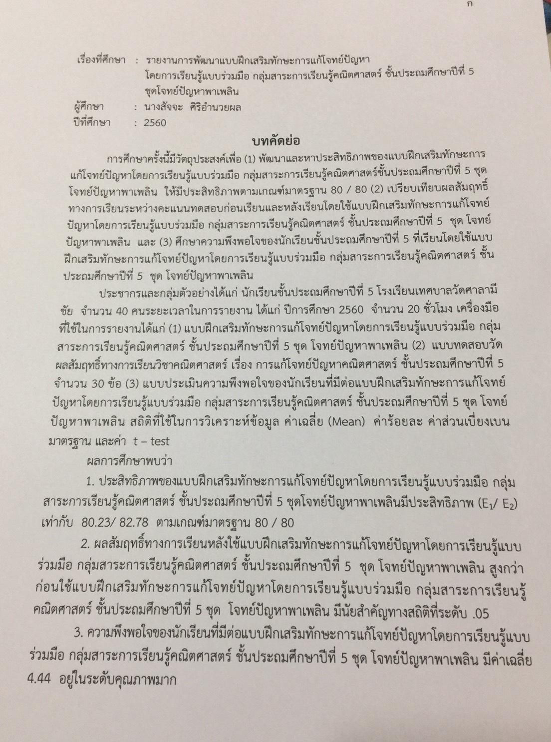 ชื่อผลงาน : รายงานการพัฒนาแบบฝึกเสริมทักษะการแก้โจทย์ปัญหาโดยการเรียนรู้แบบร่วมมือ กลุ่มสาระการเรียนรู้คณิตศาสตร์ ชั้นประถมศึกษาปีที่5 ชุดโจทย์ปัญหาพาเพลิน