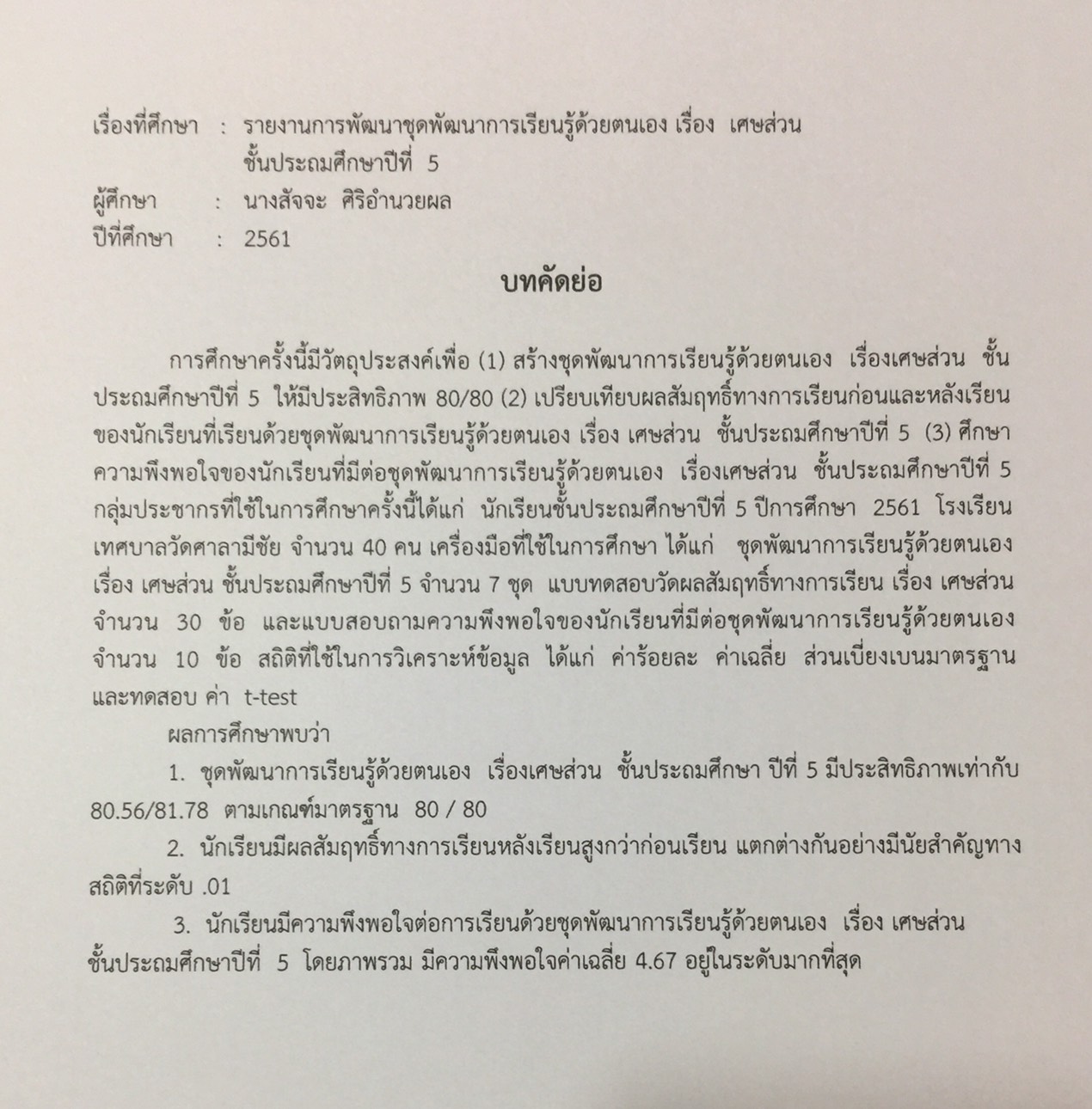 รายงานการพัฒนาชุดพัฒนาการเรียนรู้ด้วยตนเอง เรื่องเศษส่วน ชั้นประถมศึกษาปีที่ 5