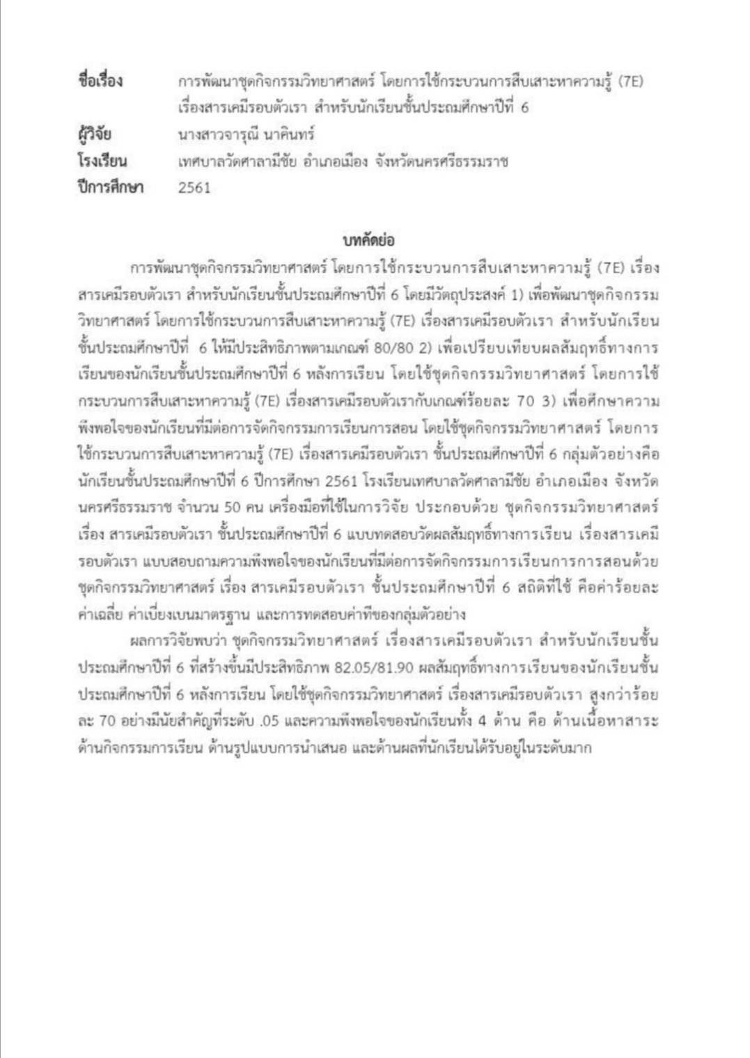 ชื่อผลงาน : การพัฒนาชุดกิจกรรมวิทยาศาสตร์ โดยใช้กระบวนการสืบเสาะหาความรู้ (7E) เรื่องสารเคมีรอบตัวเรา สำหรับนักเรียนชั้นประถมศึกษาปีที่ 6